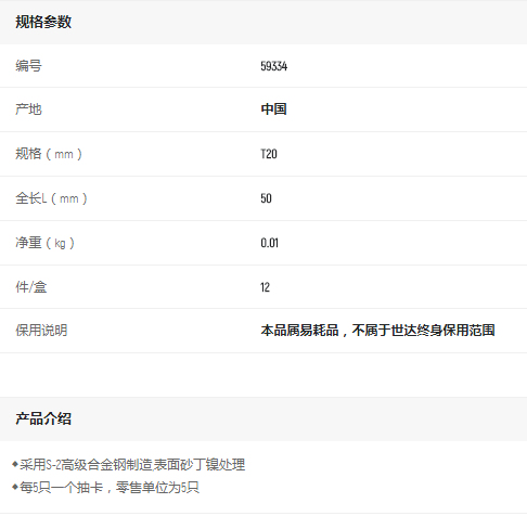 產(chǎn)品名字:世達(dá)5件6.3mm系列50mm花型旋具頭T20